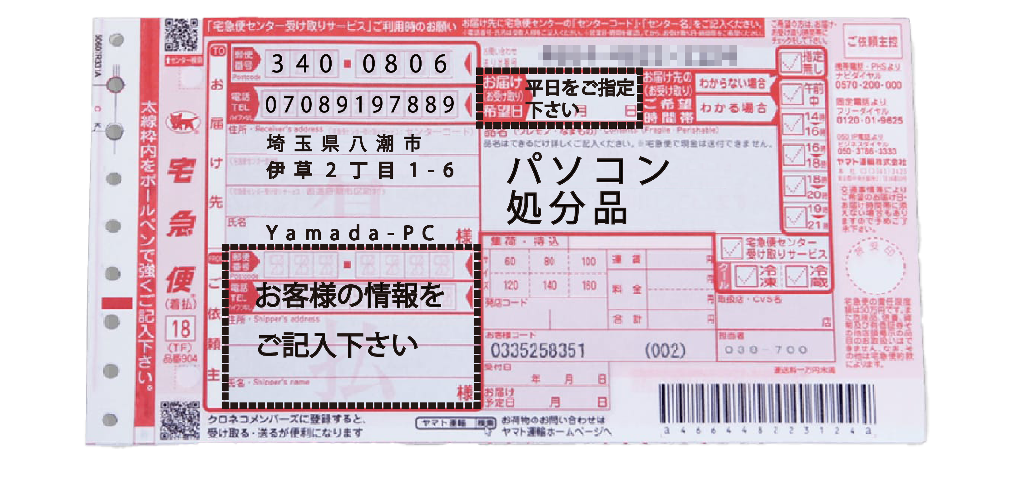 はい。「〒340-0806 埼玉県八潮市伊草2丁目1-6 Yamada-PC宛」の住所になります。平日のみお受けしております。