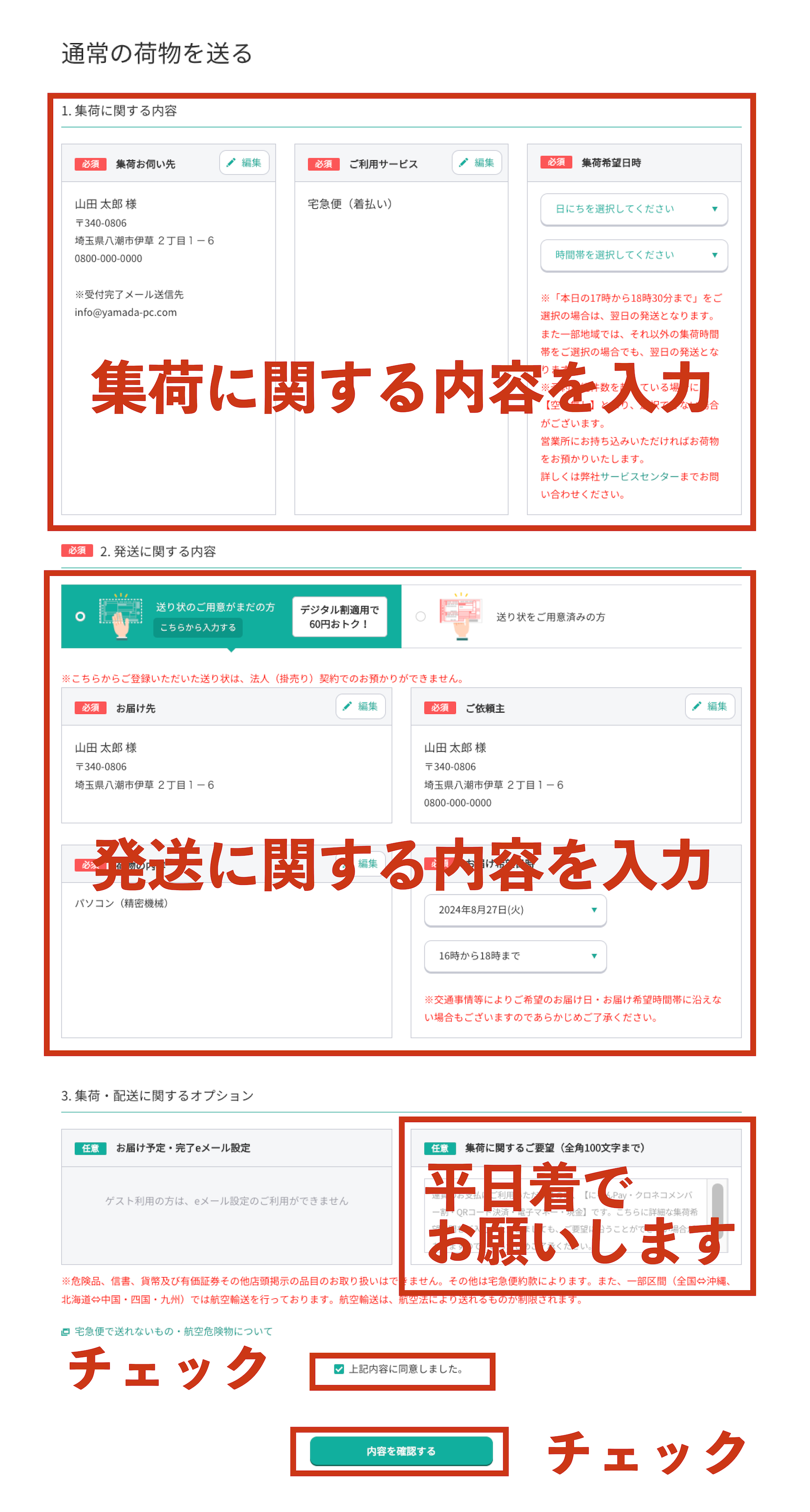お客様の住所は送り主の欄に書いて下さい。送り主の欄を「空白」にする、「同上」と記入したお荷物は受取拒否をし、返送されます。
