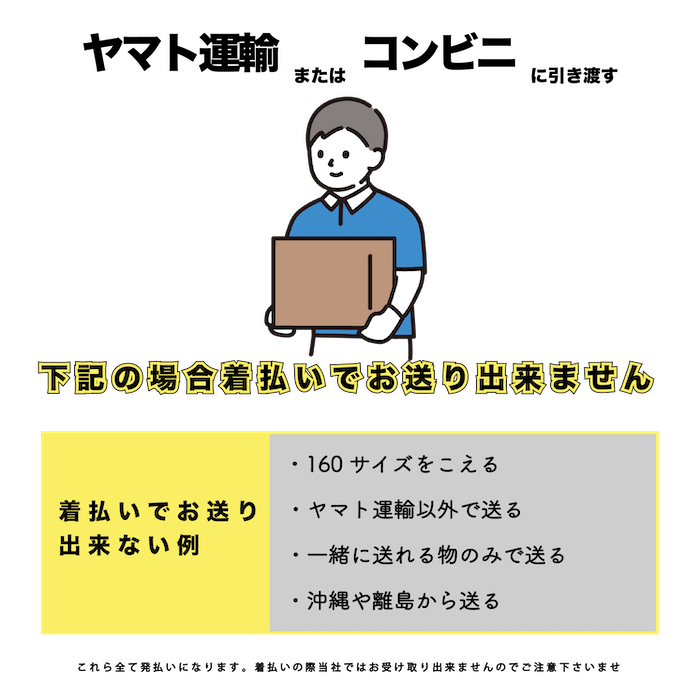 宅急便サイズが合計160cmとなりますのでこちらの商品は着払いでは受取りできません。発払い(送料お客様ご負担)であればお引取り致しますのでご検討下さい。